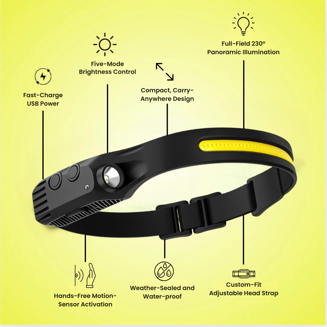 It features motion-activated on and off control, adjustable brightness, and a USB-rechargeable battery that delivers up to 6 hours of runtime on low brightness. The adjustable strap provides a secure, comfortable fit, and the weather-resistant build makes it suitable for both indoor and outdoor use.